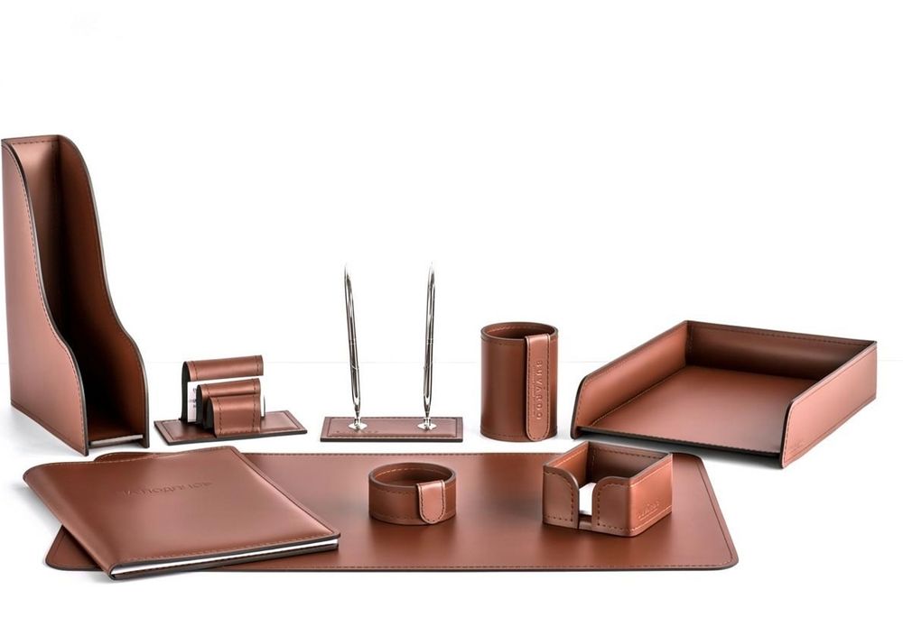 Набор на стол руководителя из коричневой кожи оттенок каштан для офиса